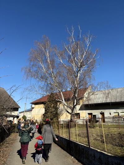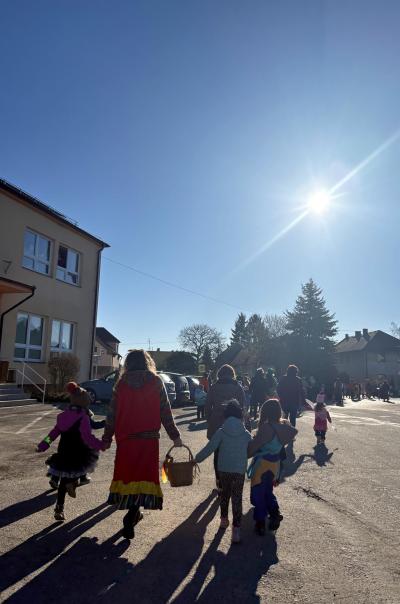 Poté nás přivítali také v jídelně, kde pro nás měli připravené další dobroty. Následně jsme pokračovali obcí, kde nás místní hospodyňky srdečně přivítaly – zazpívali jsme jim a za odměnu jsme dostali další malé pohoštění. U kapličky jsme si společně udělali hromadnou fotografii a poté jsme se vydali zpět do školy a školky.